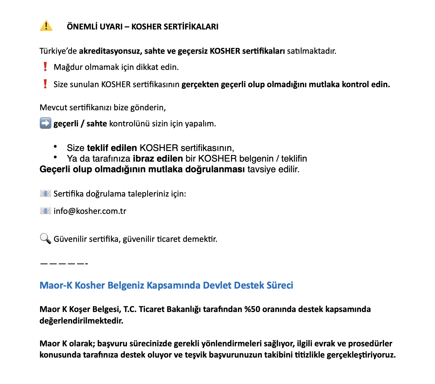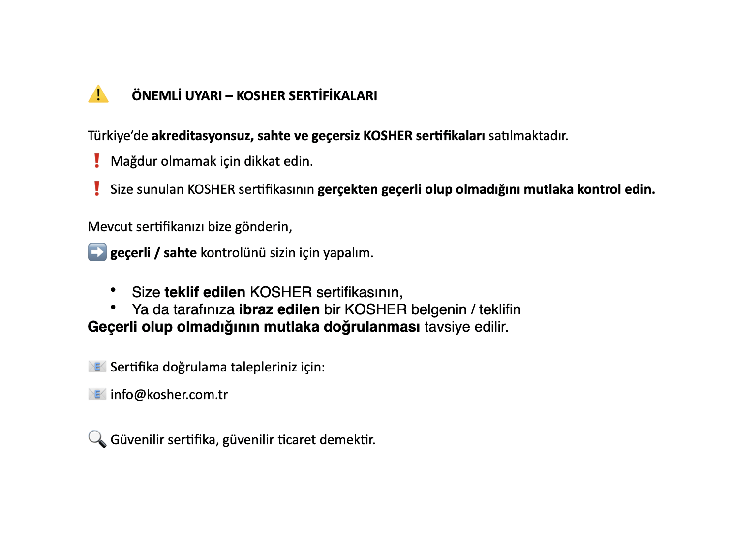 "Kosher Sertifikası" size ulusal ve uluslararası kapsamda geniş ve güvenilir sertifikasyon olanakları ve kurumsal yapı ile ürün belgelendirmede, markanıza ve firmanıza, ulusal ve uluslararası alanlarda saygınlık ve katkı sağlamayı hedeflemektedir.